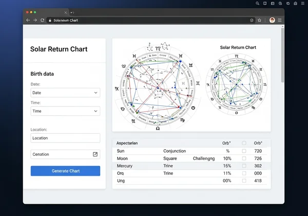 You can get an instant, detailed analysis right here. Our website offers a free and powerful Solar Return Chart calculator that generates a beautiful, easy-to-read chart and provides interpretations to help you understand your unique aspects for the year ahead.